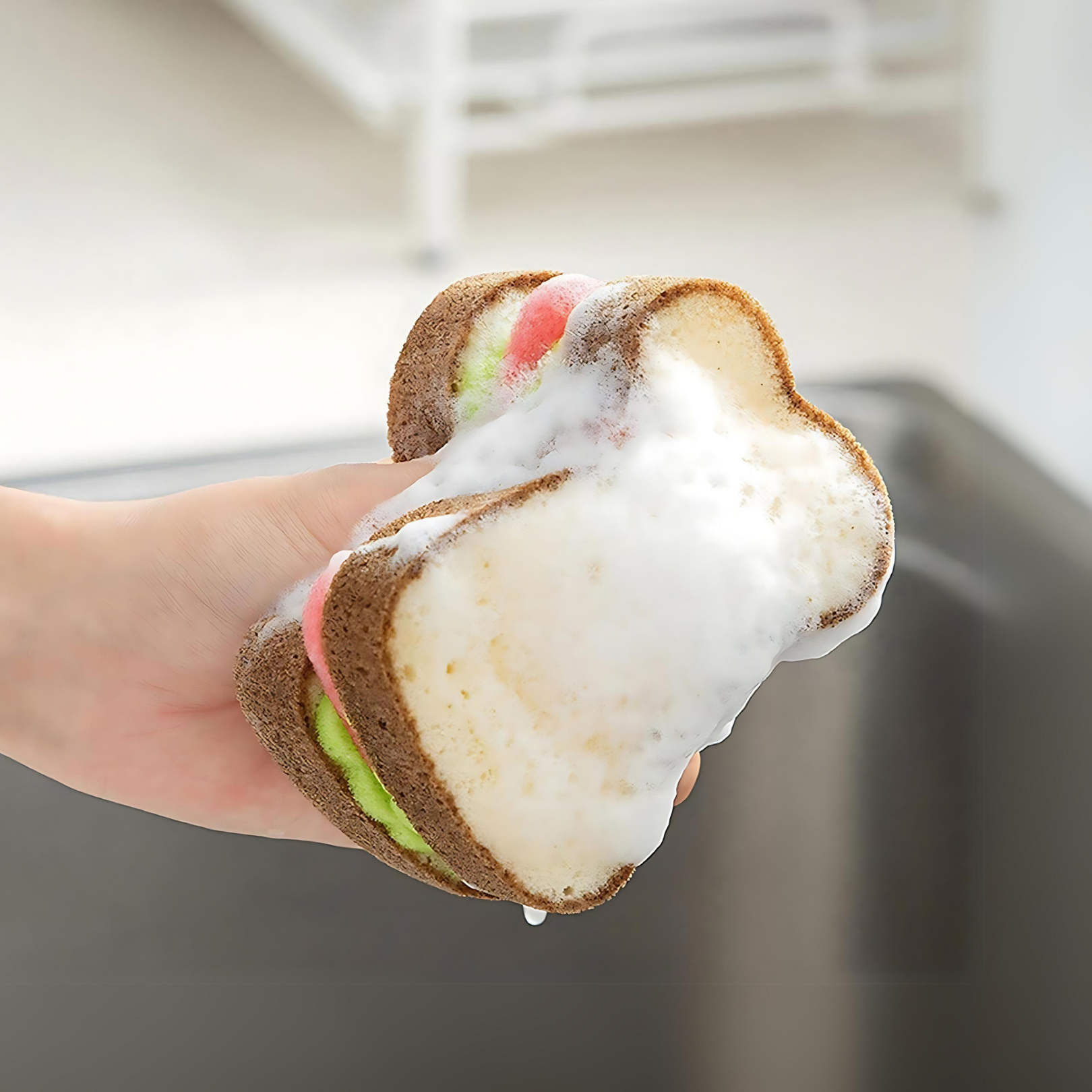 Transforma la rutina de limpieza de tu cocina con la divertida y funcional Sándwich Esponja Lavaplatos. Diseñada para parecerse a un delicioso sándwich, esta esponja no solo es eficiente sino también un añadido alegre a tu fregadero.