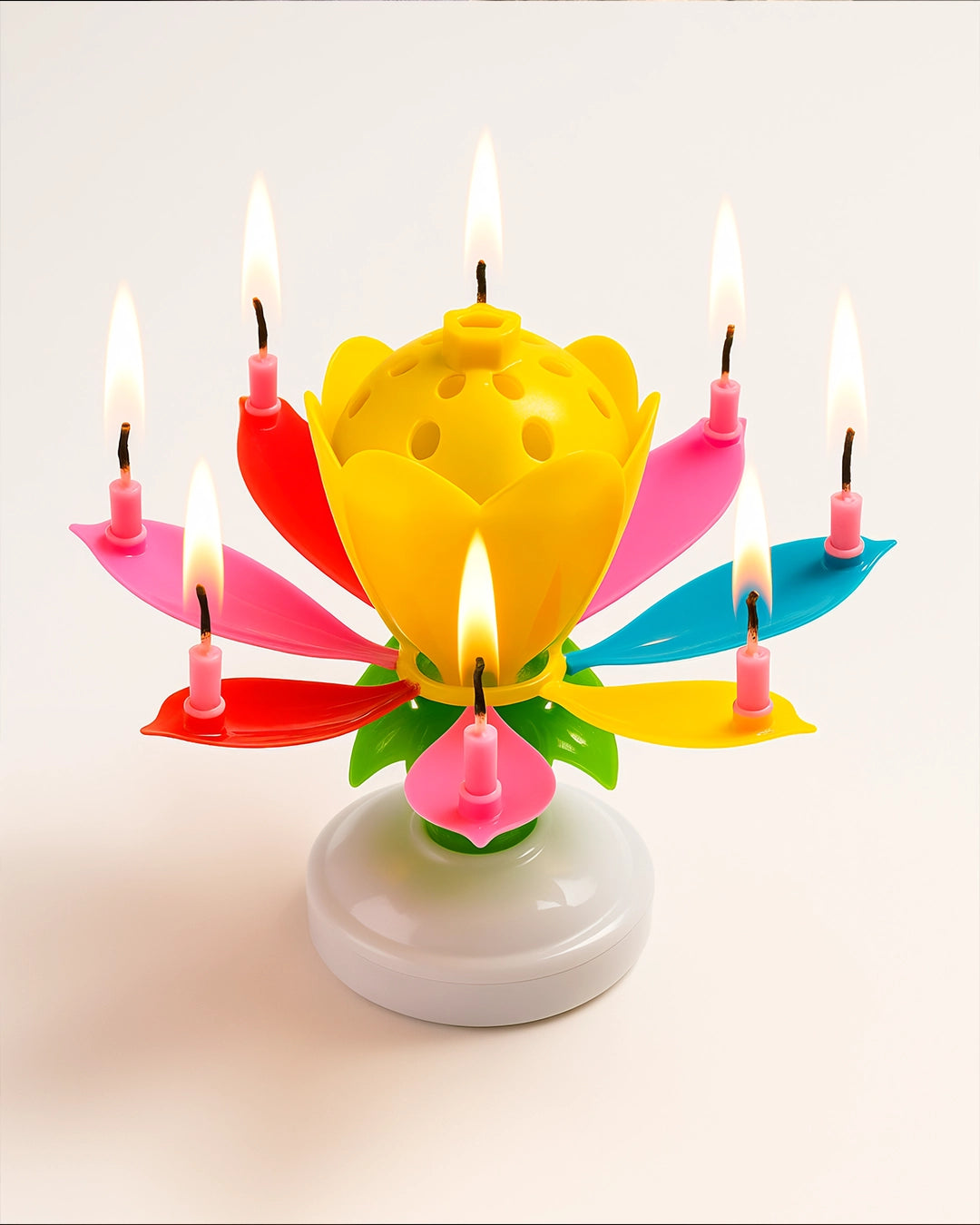 ¡Una explosión de color, música y sorpresa que transforma cualquier pastel en una experiencia digna de recordar! En forma de flor de loto, con pétalos multicolor que se abren lentamente y revelan una vela central encendida. Un show visual que roba sonrisas.